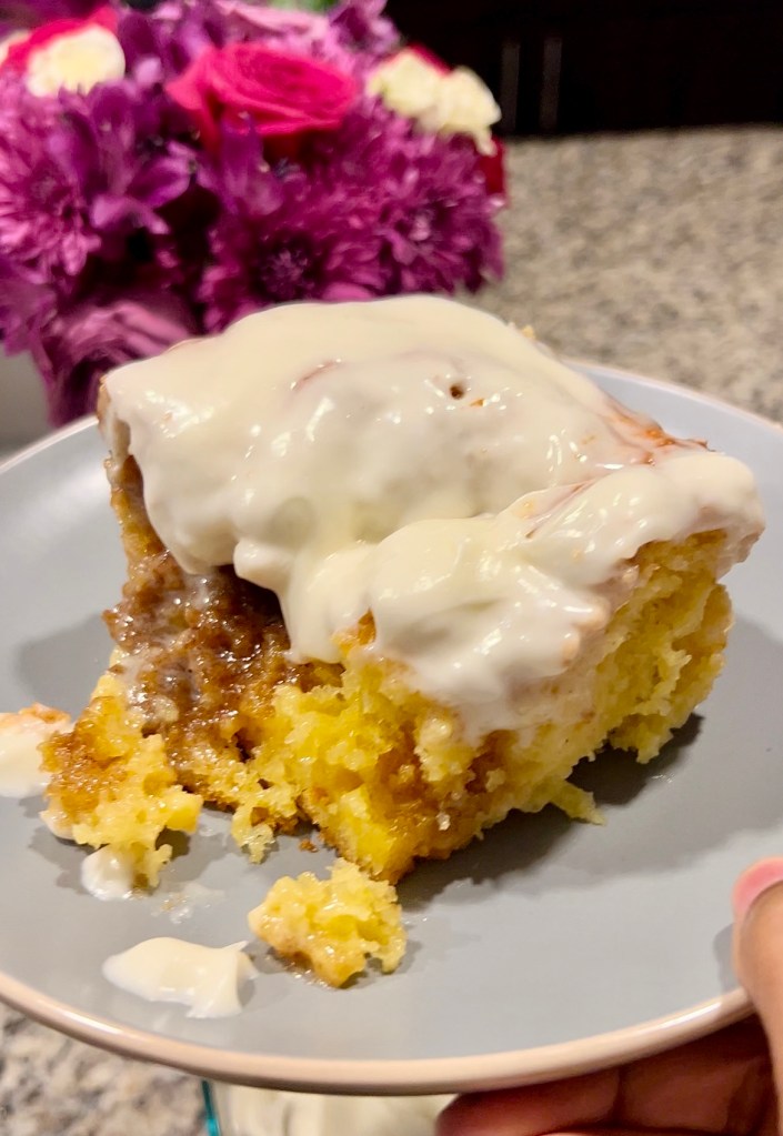 What better way to start off a chill Sunday morning than a low effort cinnamon roll cake? This super easy recipe is deliciously sweet, ready in less than an hour, and made from boxed yellow cake mix!