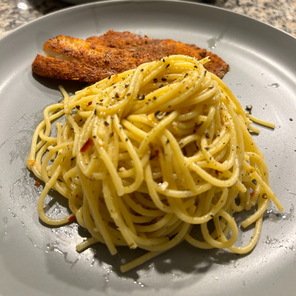 Our recipe is inspired by the Midwest Foodie Blog – I usually switch out the freshly sliced garlic for a jar of minced garlic instead, double up on the crushed red pepper because we love spicy, and skip the capers (not a fan). The pasta is light, spicy, then we usually pair it with a baked fish like tilapia or mahi mahi – and voila! You got an easy dinner ready in less than 20 minutes!