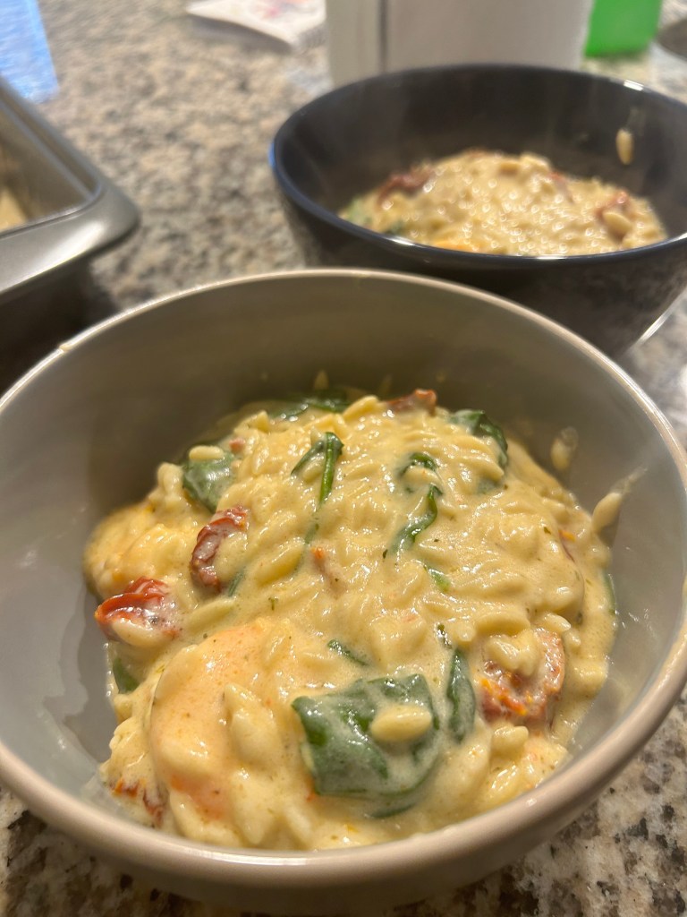 When I say that I’m obsessed with this recipe I mean it – I’ve already made it twice in one month! Two things I never had much of prior to making this – orzo pasta and Boursin cheese – and who knew how harmoniously wonderful they were together? I came across this meal on TikTok and all you really need is one pan and 20 minutes.