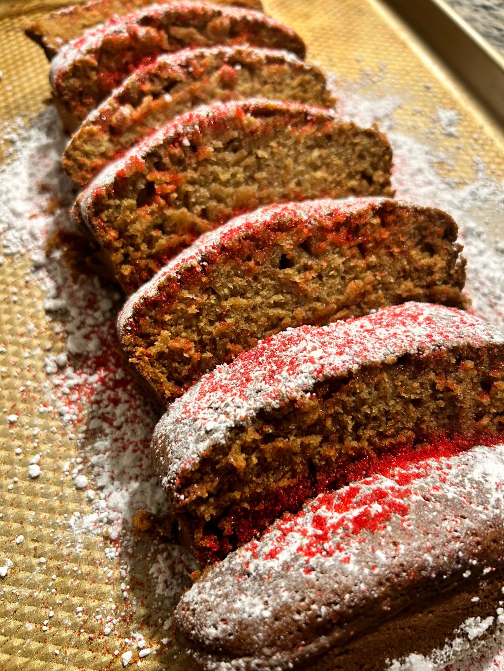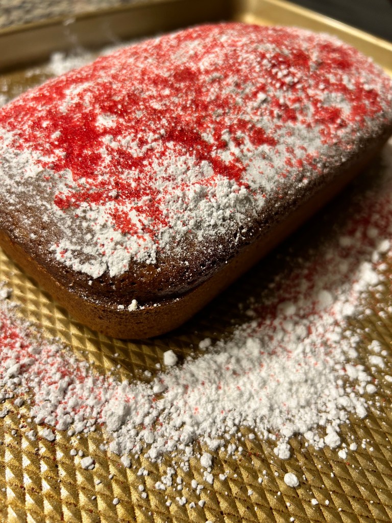5-10 minutes to prep and less than an hour in the oven and you got the perfect last minute holiday bake! To crown my creation, I went with a combined sprinkle of powdered sugar and some red edible glitter leftover from Valentine’s Day. Slightly spiced and perfectly sweet, I’d give this holiday recipe two candy canes up!