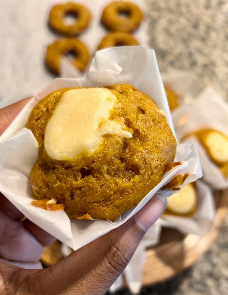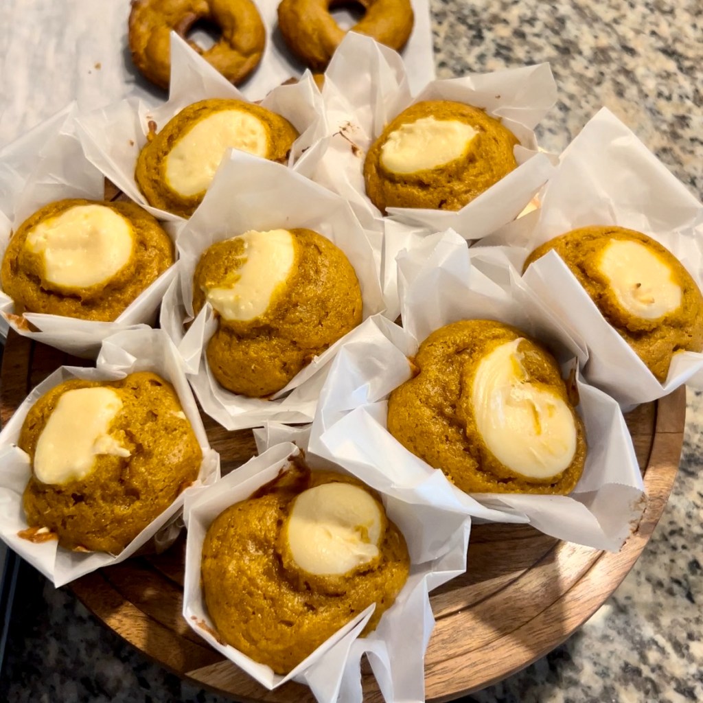 So I couldn’t find pumpkin spice at the store and I substituted ground cinnamon and ginger, no biggie. But the real annoyance came when I tried to mimic the fancy folded parchment that the muffins come in, Starbucks-style. I restarted so many times, but had to push forward because I feared the muffins would be too top-heavy with the cream cheese to just use regular liners. Then came the cream cheese filling – mixing without a hand mixer was laborious, spooning it into a ziploc bag was messy, and piping a “delicate dollop” onto each muffin? They looked more like deformed blobs. By the end, I was pretty over it. But I came out on the other side and can confirm it is so worth it!