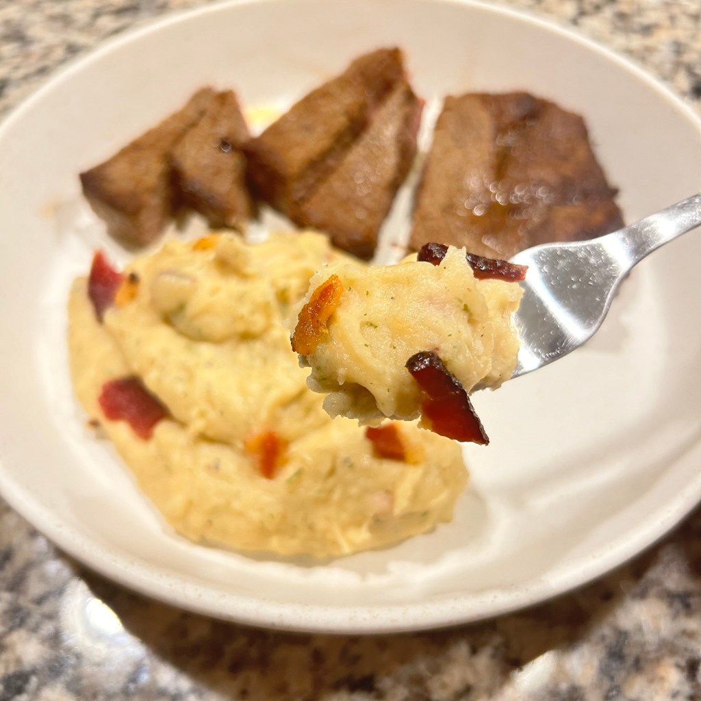 If you are still brainstorming Thanksgiving side dishes, look no further! These Bacon Ranch Mashed Potatoes are also great in a pinch, I’ve made them for weeknight dinners and paired with a chicken, fish, or steak – SO good. There are two ways to whip them up: a simple version and a super simple version. Since I always seem to be short on time, I usually go with the super simple one, starting with a trusty tub of Bob Evans Mashed Potatoes and bacon bits—dress it up just a little, and you’re done!