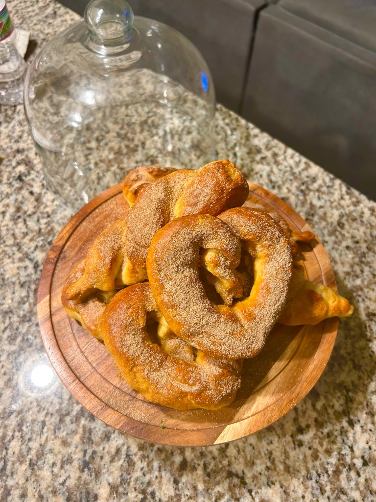 But the baking itch didn’t go away, so I finally decided to tackle something that’s been on my must-try list forever: soft pretzels. I’d been putting this recipe off because I was a little intimidated. Something about boiling dough before baking just sounded like it would be a disaster for me. But they turned out amazing! Soft, chewy, and with the perfect golden crust. And because I’m cinnamon sugar’s number one fan, I went pretty heavy with the dusting, and they were simply wonderful. I absolutely will be making these again and am already brainstorming additions: creamy glazed icing for dipping, or go savory and do a pepperoni topping with melted cheese for dipping, YUM.