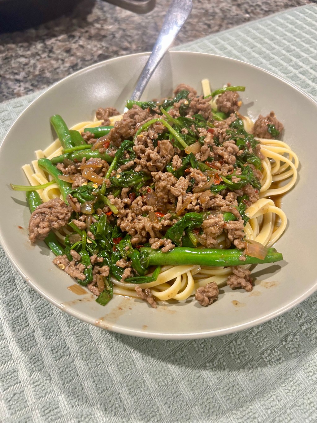 Inspired by a Pad Kra Pao recipe, it’s savory, saucy, and a touch spicy. AND a great way to get your greens in, I use an entire bag of spinach! Just call me Popeye.