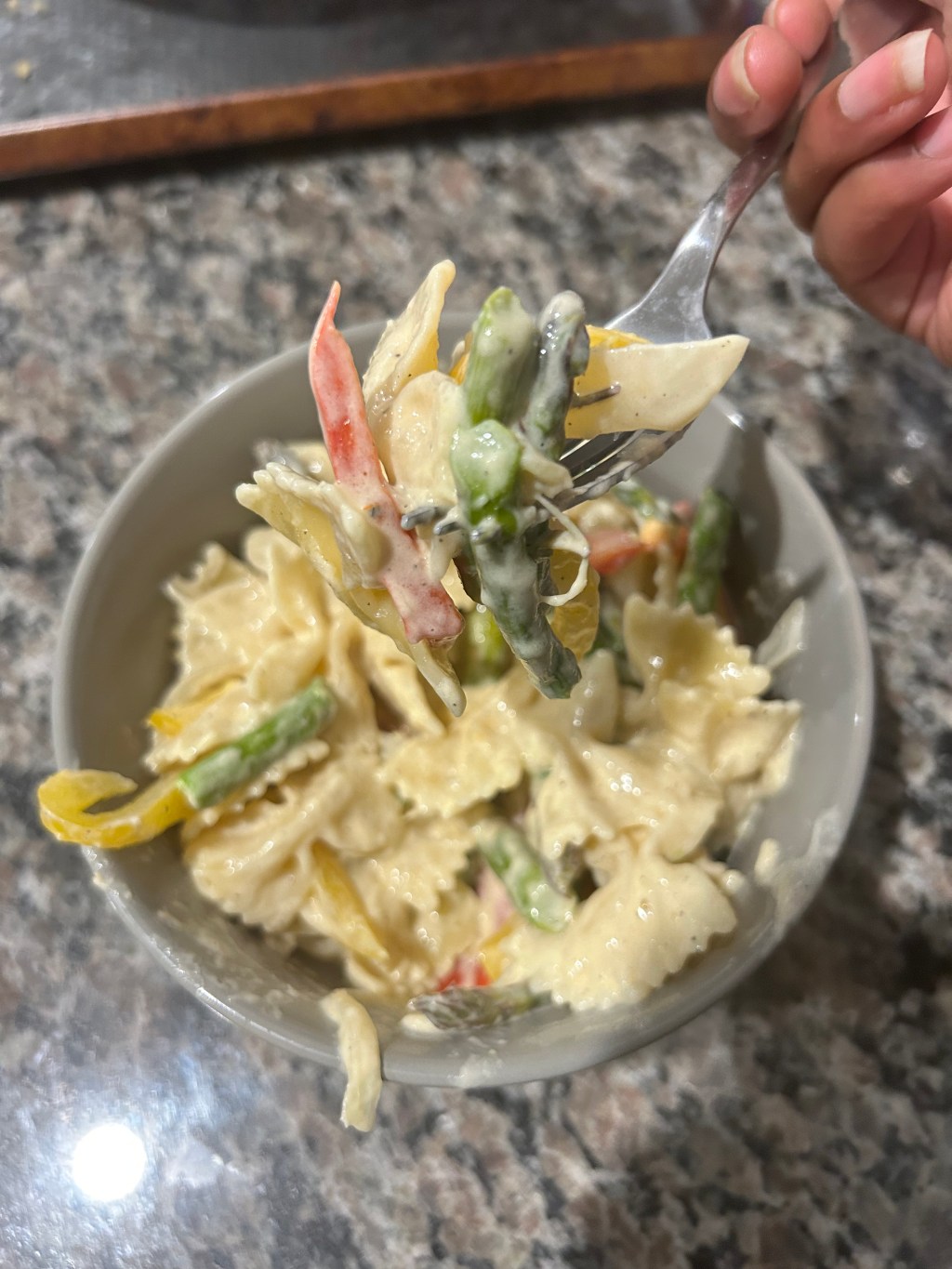 This recipe is one of the easiest meals in my rotation. PACKED with vitamins from the bell peppers and asparagus, and the sauce comes together with some heavy cream and grated parm, technically a one pot meal and the whole thing is done in about 30 minutes.